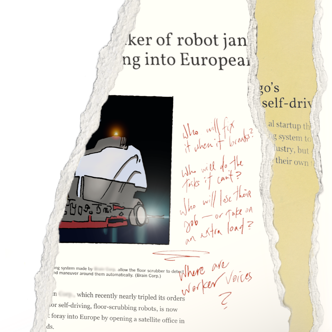The accomplishments of essential workers are everywhere — clean floors, sanitized tables, objects made from recycled plastics — though the activities themselves often occur behind the scenes. This illustrated article identifies a set of visual patterns (or “tropes”) that are used in news reporting on automated technologies being implemented in essential workplaces, and ultimately obscure workers.